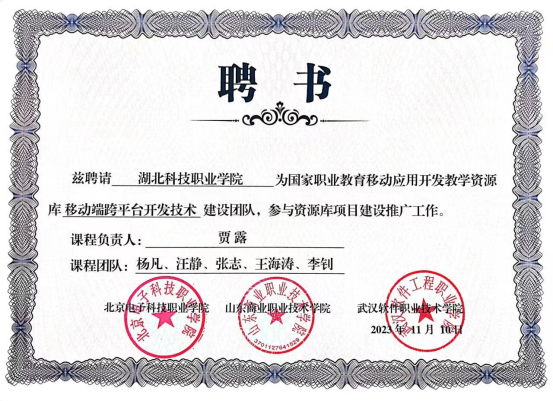 本网讯(通讯员 张志 文/图)近日,华体会正规平台移动应用开发团队收到参与国家职业教育资源库建设的聘书,受聘为国家职业教育移动应用开发教育资源库《移动端跨平台开发技术》建设团队,参与资源库项目建设推广工作。“移动应用开发”专业教学资源库建设是教育部落实中共中央办公厅、国务院办公厅印发的《关于深化现代职业教育体系建设改革的意见》的重点任务之一,由北京电子科技职业学院、山东商业职业技术学院和武汉软件职业技术学院联合主持开发。
