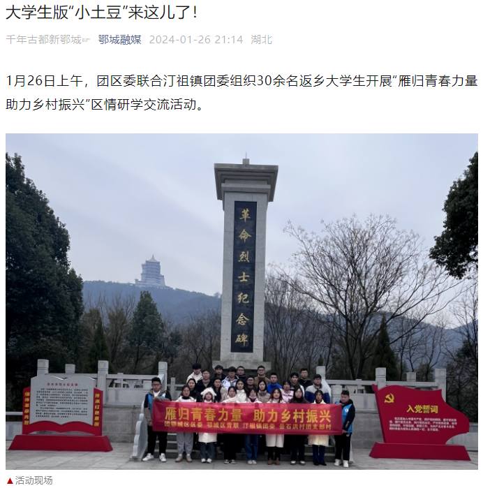 2023级石油工程技术1班李逸同学积极参加鄂州市鄂城区团委组织的“雁归青春力量 助力乡村振兴”区情研学交流活动,并被当地媒体报道。通过到岳石洪村红色研学基地参观学习,李逸看到了自己家乡“变废弃矿山为绿水青山、变绿水青山为金山银山、变金山银山为幸福靠山”的“三变”过程。他表示自己今后会更加关注家乡的建设与发展,宣传汀祖当地丰富的农文旅资源,在求学之路上争做家乡的宣传员,努力在未来回归家乡、反哺家乡。