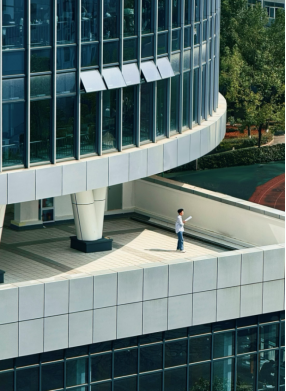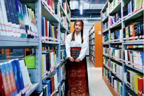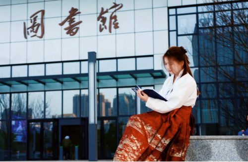 除了记录新楼本身和师生活动,摄影作品还捕捉到了中华传统文化与现代建筑的和谐共存。穿着马面裙的学生在新楼内外穿梭,自信从容的身姿展现了民族风情与现代建筑的完美融合。
