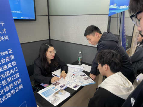 活动现场,学生仔细观看到场企业的简介,向相关企业沟通咨询,与HR交流个人规划,充分听取企业方意见,最后结合企业特点、个人意向等因素选择合适企业投递简历。