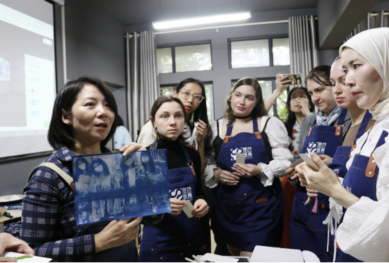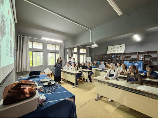 一试一思、一布一染、一绢一韵。19日,中南民族大学何红一教授及留学生一行前往鲁巷校区传媒艺术学院,走进学校非遗研究中心“艺守青蓝”非遗植物蓝染课堂。课堂上,主讲教师欧亚梅从我国传统非遗植物蓝染文化切入,为留学生介绍了蓝染文化情景与工匠技艺精神。