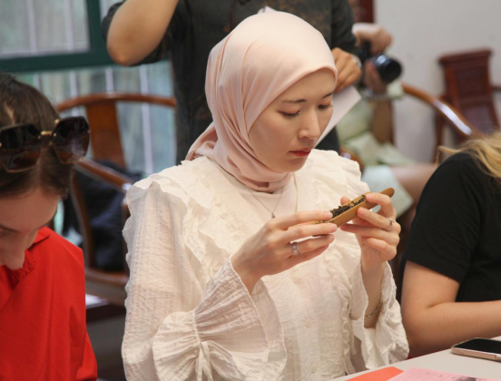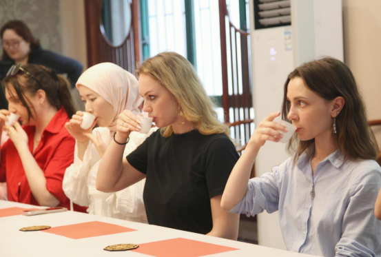 随后,陈蔚老师向全体成员讲述生煮羹饮、烹茶、点茶、泡茶等中国饮茶文化,并向留学生讲授茶叶的专业审评方法。通过看干茶、赏汤色、闻香气、品滋味、触叶底等步骤,留学生们纷纷用中文填写《茶叶品鉴卡》记录自己对茶文化的体验。