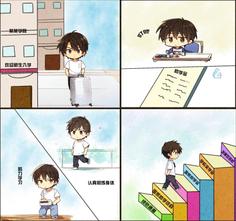 在这幅四格漫画中,真实地记录了他入学以来的学习生活情况:进入大学校门之时,因家庭经济困难颇为忧虑,但通过入学绿色通道、国家助学金等资助方式,缓解了经济压力,并得以安心学习,最终学业有成。