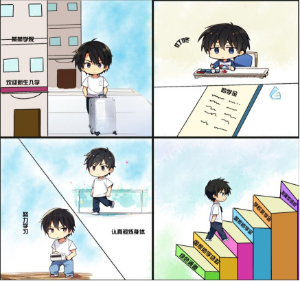 传媒艺术学院荣获“国家励志奖学金”的2022级学生罗浩,发挥专业优势,用漫画的形式表达了资助政策所给予的帮助。漫画中,主人公在进入大学校门之后,因家庭经济困难颇为忧虑。幸运的是,通过入学绿色通道、国家助学金等资助方式,缓解了经济压力,并得以安心学习,最终学业有成。罗浩代表着万千感恩资助的同学,彰显了学院资助育人的成效。