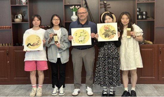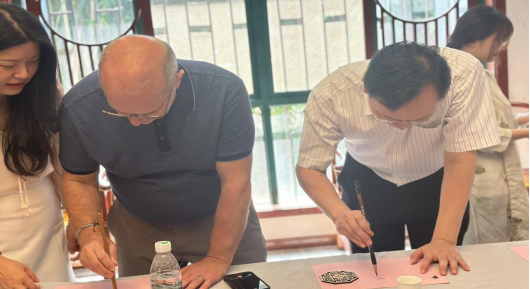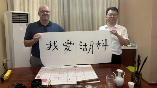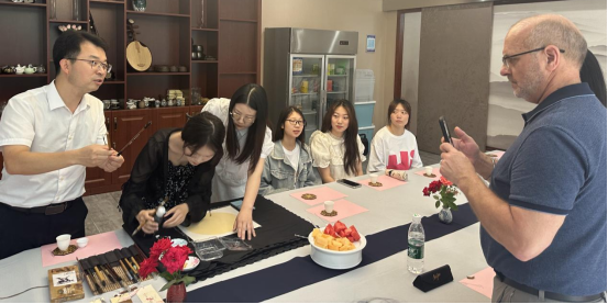 写书法,墨香雅集共传承。在书法体验环节,电信工程学院党总支书记谢永平为Chester Wilson George老师和同学们介绍了中国书法的历史与渊源,经济贸易学院党总支书记冷磊现场示范教学,Chester Wilson George老师在冷磊书记的指导下,一笔一画写出“我爱湖科”,表达了对华体会正规平台的深厚情谊和无限热爱!