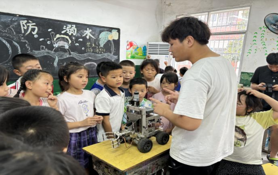 趣味机器人,科普小课堂。在工业机器人课堂上,团队成员精心打造“智能机器人走进乡村”七彩课堂,为小朋友们讲解机器人原理及零部件构造,带领小朋友们开展实训,给小朋友们带来了不一样的假期体验,让孩子们感受到科技的魅力,激发他们的科学意识,提高科技素养。