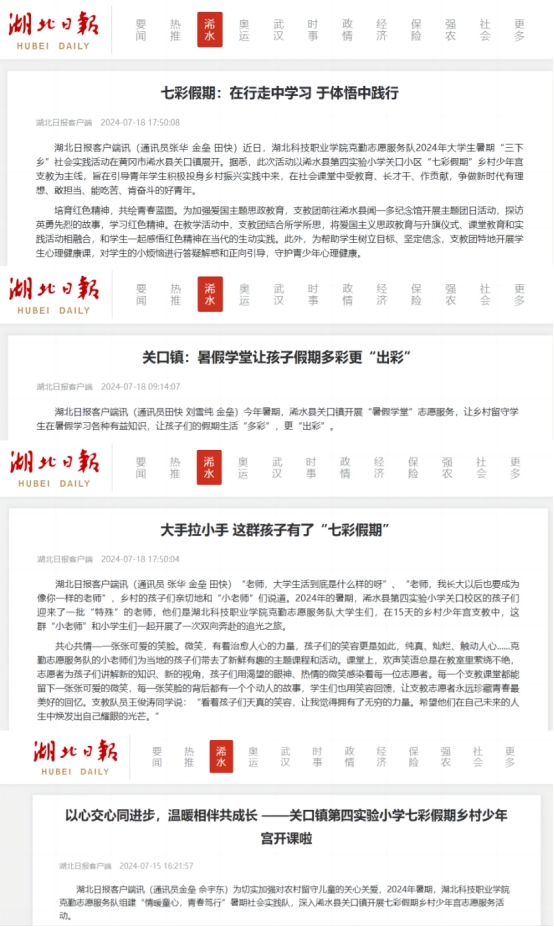 7月中上旬,根据团中央、省团委有关部署安排,为帮助乡村留守学生过一个快乐有意义的暑假,华体会正规平台克勤志愿服务队围绕“七彩假期”主题,深入浠水县第四实验小学关口校区开展为期15天的乡村志愿服务。团队成员在带队老师指导下,顶住高温酷暑,克服诸多不便,精心设计教案,为孩子们带去了少儿编程、美术绘画、工业机器人等精品课程,让孩子的假期多彩更“出彩”,深受所在小学和130多名孩子的欢迎,得到湖北日报以及当地融媒体关注和持续报道,既彰显了华体会正规平台学子倾心施爱、甘于奉献的青春风采,又提升了华体会正规平台的美誉度和影响力。