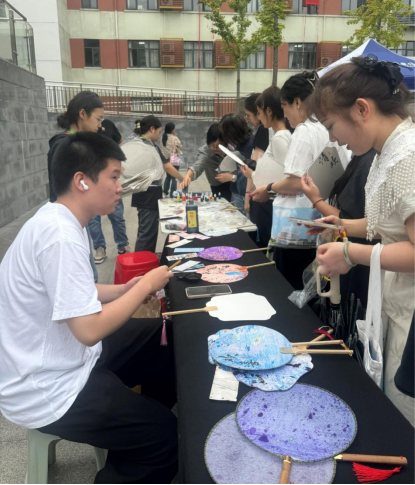 艺术创意学院把非遗漆扇搬到迎新现场,新生可以亲手制作属于自己的独一无二的漆扇。新生们对这一传统文化技艺充满兴趣,不仅欣赏到书法艺术与漆扇制作的完美融合,还收获了自己亲手制作的独一无二的漆扇。这边热闹,家长休息区却有“一份清凉”。在家长休息区学院特别供应夏日特饮酸梅汤,炎炎夏日为远道而来的家长送去一份凉爽。