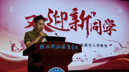 军训期间,退伍大学生万冰在“朋辈讲堂”上,用自己在军营的训练、生活、成长经历和军营感悟,讲述了从军报国的初心使命,分享了部队“大熔炉”淬火成钢的青春故事,加深了同学们对军旅生活的认识,激发了同学们的爱国热情。同时,为庆祝中华人民共和国成立75周年,学院创新组织新生传唱活动,用歌声告白祖国,展现湖科学子为实现中国梦而努力奋斗的青春风采。