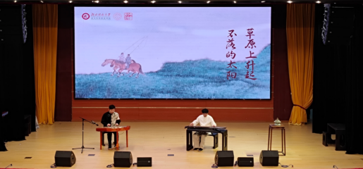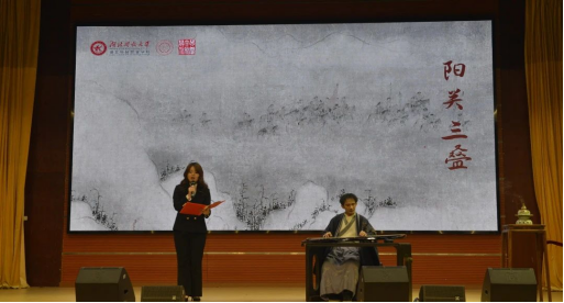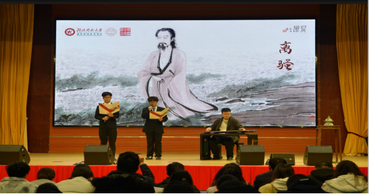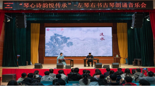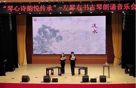 音乐会在两位同学深情朗诵伯牙子期的经典历史故事里缓缓拉开序幕,将众人带回到那个充满传奇色彩的岁月。紧接着,学院吕双与陈嘉伟老师携手为现场满怀期待的师生们奉上了双古琴合奏《流水》。