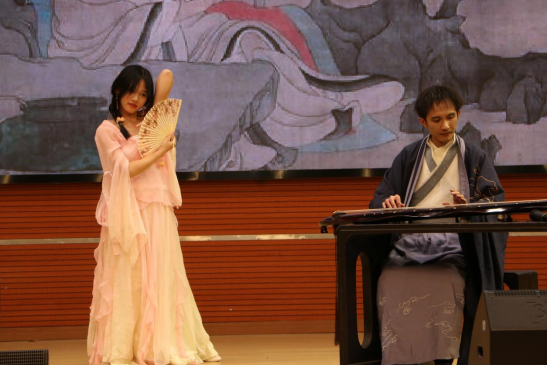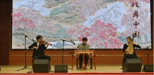 接下来的演奏中,既有古琴和扬琴的碰撞,扬琴、琵琶、小提琴的弦舞合奏,琴音与诵读的融合,又有舞蹈伴随着琴声翩然而至,让观众置身于民乐与西洋乐融合的奇妙世界中,漫步于充满诗意与宁静的世外桃源。不同的乐器带来的不同文化脉络激情相拥,为在场师生带来一场别开生面的视觉与听觉的双重盛宴。