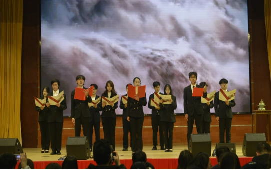最后,由机电工程学院的十二位学子齐聚舞台中央集体朗诵——《长江》。滔滔江水奔腾不息的气势和历史的厚重在他们掷地有声的朗诵声中展现,令每一位聆听者都能深切感受到长江所蕴含的磅礴力量与深沉底蕴,沉浸于这一场关于母亲河的诗意礼赞之中。