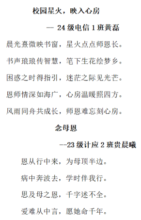 为营造知恩·感恩的温情氛围,人工智能学院教师积极引导学生们以“笔墨传情”的方式,分享感恩小故事。黄磊同学以自赋诗词形式表达对恩师辛勤付出的真挚感谢;贵晨曦同学通过赋诗感谢母亲的伟大付出;詹诗怡同学则分享了在火车上的一次偶遇,表达了对陌生奶奶主动援助自己的真诚感谢和祝福等。同学们一个个鲜活的故事,一句句真挚的情感,如同一颗颗感恩的种子,播撒在心田。