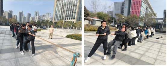 “加油!加油!”“双腿微蹲,绳子往后拉,我喊口号大家一起使劲”只听一声哨响,师生拔河比赛火热开场,两边队员双手紧握长绳,憋足了劲拼命往后拉脸憋得通红却丝毫不放松,参赛队员齐心协力拧成了一股绳。双方啦啦队也不甘示弱,加油声、呐喊声此起彼伏,场面扣人心弦,最终教师队伍在同学们的谦让下凭借“实力”赢得了本次比赛。