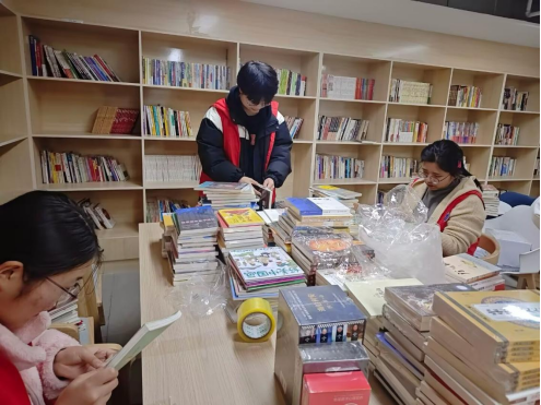 志愿者整理书籍 李盼/摄