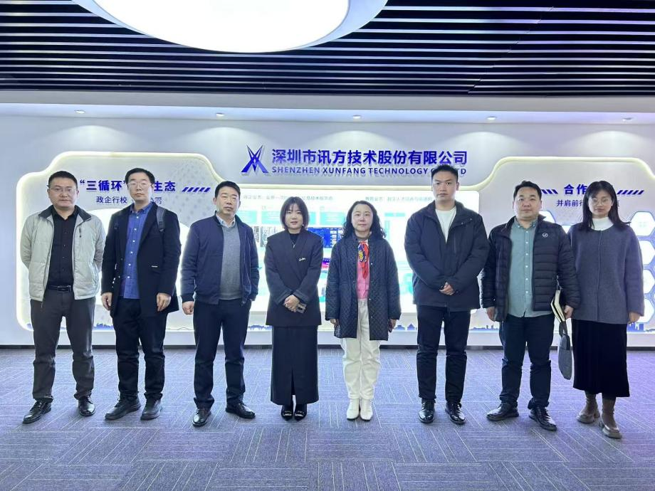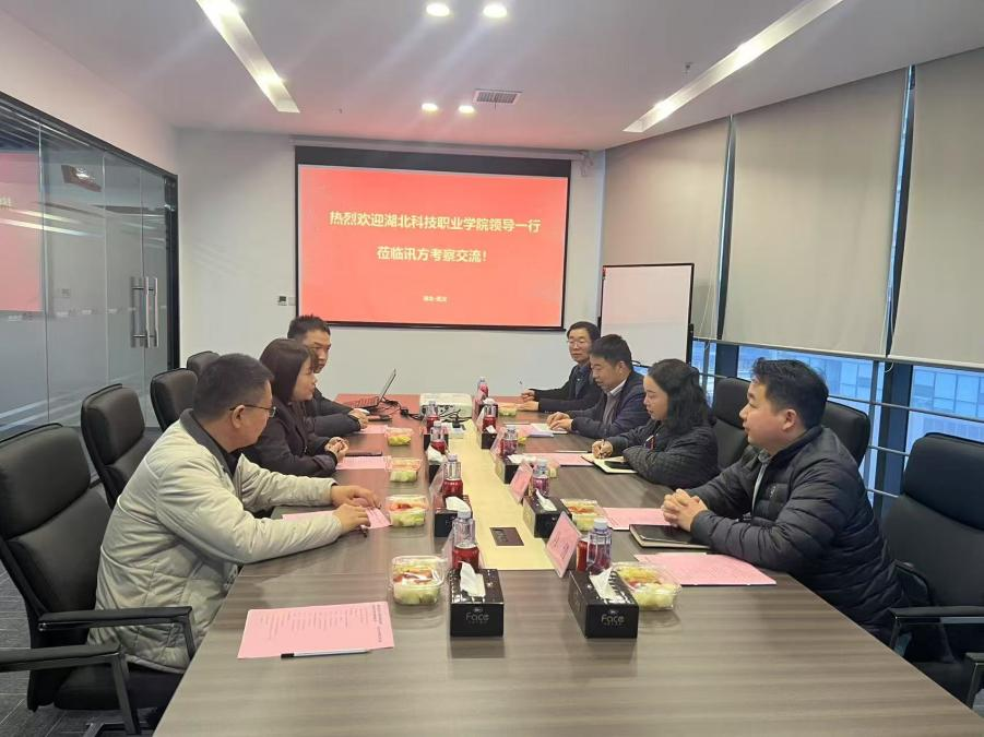 在深圳市讯方技术股份有限公司武汉基地,华中片区总经理易君、培训业务总监潘阳、项目业务总监涂一祥等热情接待肖潇一行。肖潇一行通过展厅参观深入了解了该企业在5G通信、云计算及鸿蒙生态开发等领域的核心技术成果,重点观摩了与华为等头部企业共建的产教融合案例。