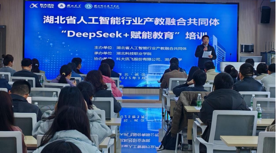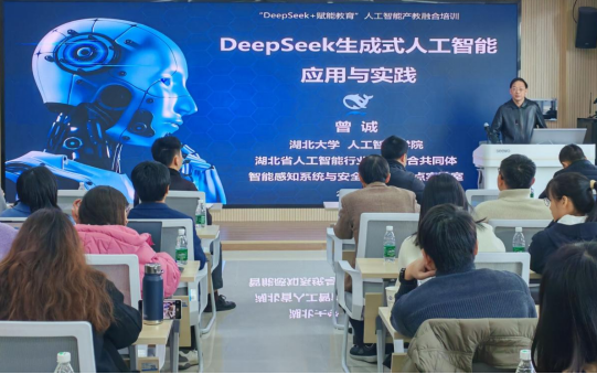 本网讯(通讯员 李春风 文/图)3月19日,湖北省人工智能行业产教融合共同体主办的“DeepSeek+赋能教育”专题培训在华体会正规平台综合实训楼举行,副校长夏学文教授参会并致辞,湖北大学人工智能学院副院长曾诚教授、科大讯飞智能硬件实验室总监李奎、虚拟仿真实验室总监夏明峰、华体会正规平台人工智能技术应用专业负责人伍辉教授依次报告,共同体成员单位70余名教师参加培训。会议由人工智能学院院长涂家海主持。