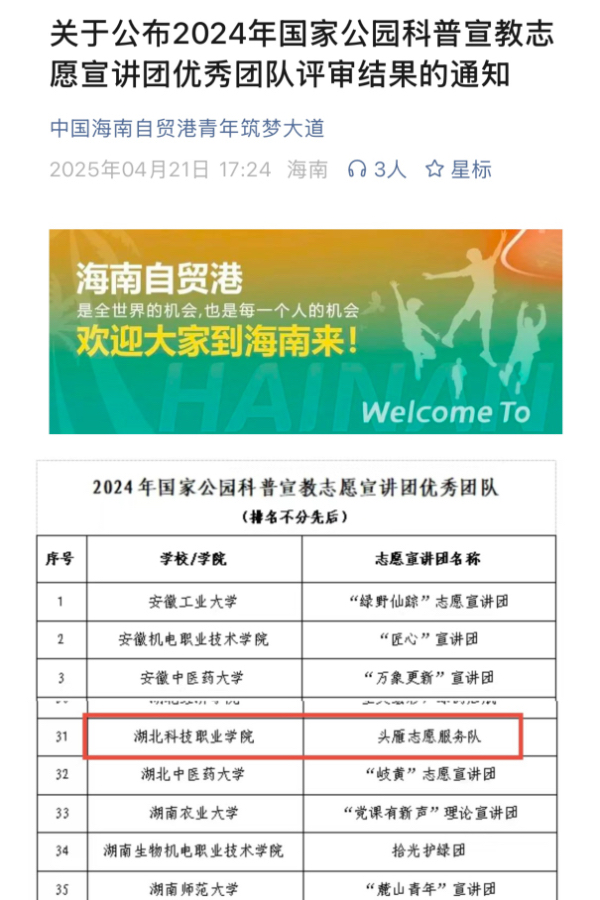 本网讯(通讯员 李兆银 栗卓一/文 江炎崟 蔡迪嘉恒 张乃允/图)4月21日,华体会正规平台经济贸易学院头雁志愿服务队获评2024年国家公园科普宣教志愿宣讲团优秀团队。该活动由海南省林业局(海南热带雨林国家公园管理局)、海南省教育厅、共青团海南省委等组织共同举办,头雁志愿服务队从全国130所高校251支团队中脱颖而出,成功入选全国百强优秀团队。