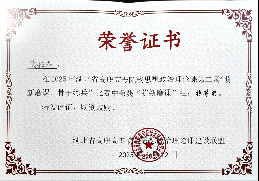 高雅芯参加的“思想道德与法治”课程“萌新磨课”组教学展示,在全省33个作品中脱颖而出并进入现场赛决赛。备赛期间,她先后制作了多份创新教案和创新课件,一次次练习和打磨作品。4月11日,现场赛在武汉职业技术大学举办,采取随机抽题、限时准备、计时讲授的方式进行。高雅芯与其他10所进入现场赛的高职院校思政教师同台竞技,最终凭借出彩表现取得第二名的好成绩,荣获“萌新磨课”组特等奖。