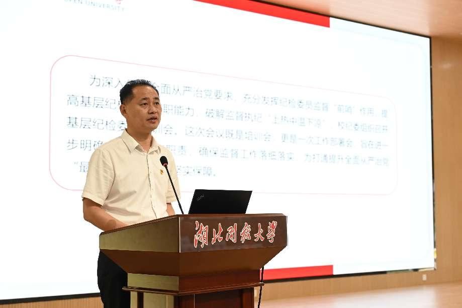 丁华涛为在“2024年湖北开放大学体系清廉文化作品”评选活动中获得“优秀组织奖”的社区教育学院、工商管理学院、艺术创意学院颁奖。在发言讲话中丁华涛表示,这次会议既是培训会,更是一次工作部署会,旨在进一步明确工作任务和职责,确保监督工作落细落实,为打通提升全面从严治党“最后一公里”提供坚实保障。他提出三点工作要求,一是形成齐抓共管合力,党总支、直属党支部、支部书记要切实履行管党治党第一责任人职责,要紧紧围绕本单位(部门)改革发展稳定开展工作,落实立德树人根本任务,发挥教育监督党员干部、组织宣传激励师生员工干事创业的作用;班子成员要切实履行“一岗双责”,在抓好业务工作的同时抓好分管范围的全面从严治党工作;纪检委员要做好专责监督工作。二是明确纪检委员的职责和任务,基层纪检委员要履行好九项职责和5项基本职权,围绕资金使用、课题分配、学生招录、人员招聘、评优评先、师德师风、人才培养、校企合作等工作过程进行监督。三是为纪检委员履职尽责创造平台,党组织书记要发挥示范引领作用,自觉主动接受纪检委员的监督提醒,为纪检委员履职尽责创造条件,加强对纪检委员的日常监督提醒;纪委、监察专员办要尽快出台纪检委员履职管理办法,加强对基层纪检委员的培训指导和实践培养锻炼,加强考核与结果运用。