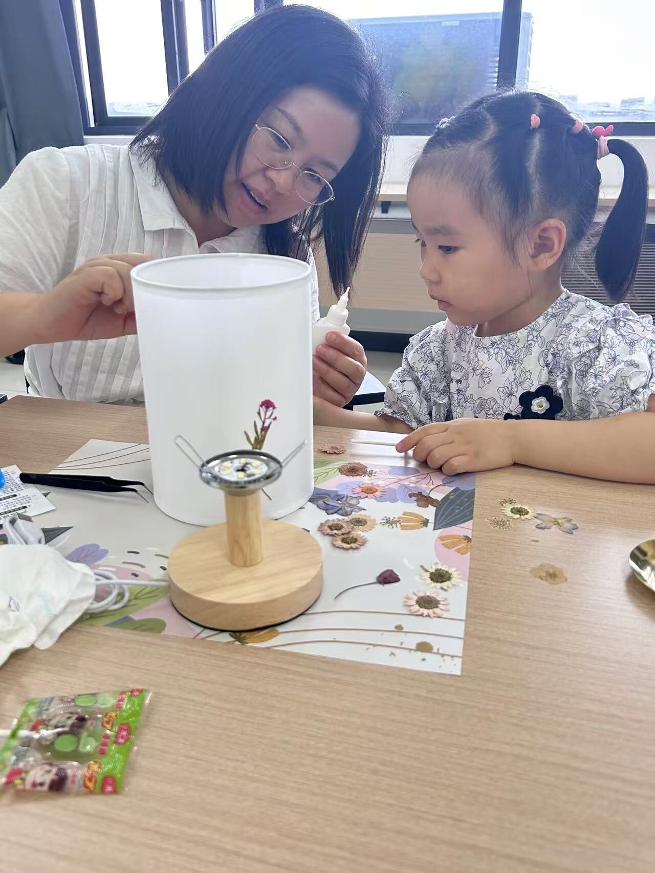活动现场,气氛热闹又温馨。在花草灯制作环节,孩子们化身“自然魔法师”,精心挑选喜爱的干花和枝叶,小心翼翼地将它们粘贴在灯罩上,组成花朵、爱心等各种造型。教职工们在一旁协助安装灯源,当一盏盏花草灯亮起,柔和的灯光透过花草的缝隙,洒下斑驳的光影,仿佛将童话世界带到了眼前,孩子们惊喜的欢呼声此起彼伏。