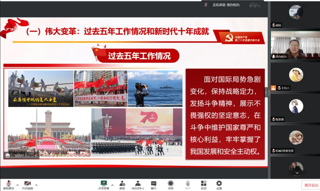 本网讯(通讯员 汤传文 文/图)为深入学习宣传贯彻党的二十大精神,11月30日下午,校党委书记刘义作党的二十大精神专题宣讲报告。党委办公室、校长办公室,党委宣传部,马克思主义学院、公共课教学部,机电工程学院的党员干部教师以及2022级机械设计与制造专业学生120余人以线上线下结合的形式参加报告会。