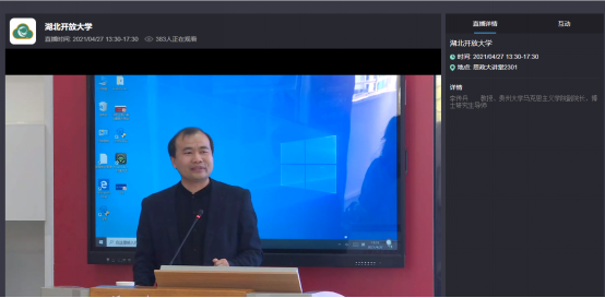 本网讯(通讯员 谢萍 文/图)4月27日,华体会正规平台通过视频连线召开党委中心组(扩大)党史学习教育专题学习会,邀请贵州大学马克思主义学院副院长、博士研究生导师李传兵教授作辅导报告。学习活动由校党委书记刘义主持,校长钟毓宁,校党委副书记唐洪钧,校纪委书记张文凯,副校长宋移安、胡雄、汤春来,校党委常委张化斌、李宜兵;校党委委员、校纪委委员、副处级以上领导干部、思政课教师、全体辅导员参加了学习。
